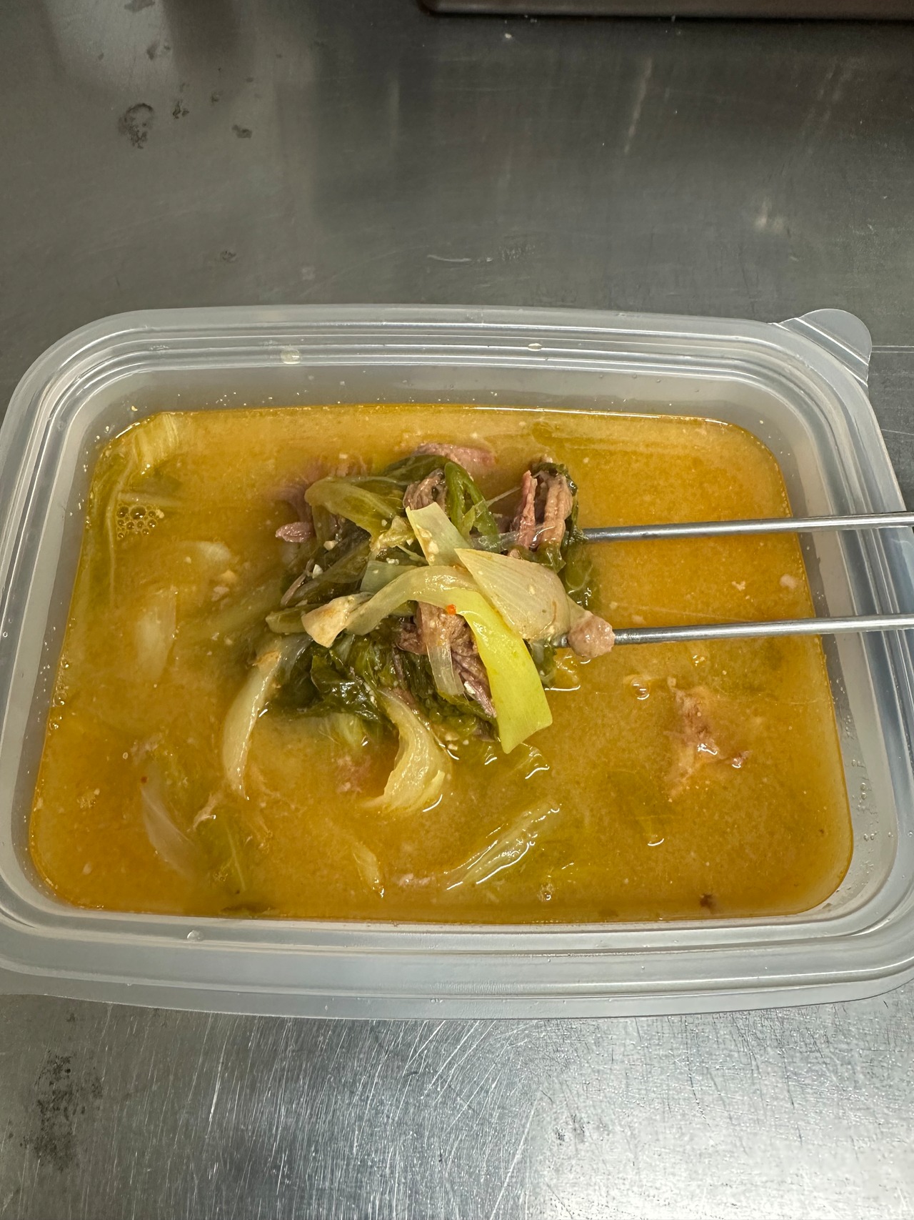 干して乾燥させた白菜や牛肉などを入れた野菜タップリの韓国式のお味噌汁です。栄養タップリのスープ。